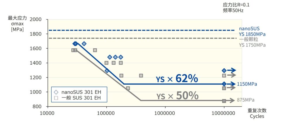 在SUS301的情况下,一般晶粒的疲劳极限一般约为屈服强度(YS)的50%,而nanoSUS™的疲劳极限为YS的62%,与一般晶粒相比,疲劳特性提高了约10%。