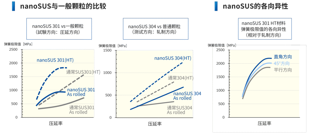 特别是在nanoSUS301中,沿轧制方向可达到1600MPa,垂直方向可超过2000MPa,表现出极高的弹簧性能,因此适用于高强度弹簧材料的用途。